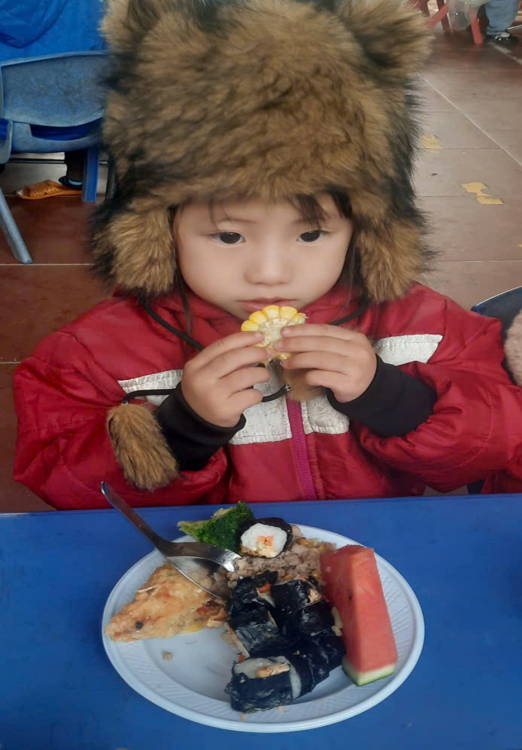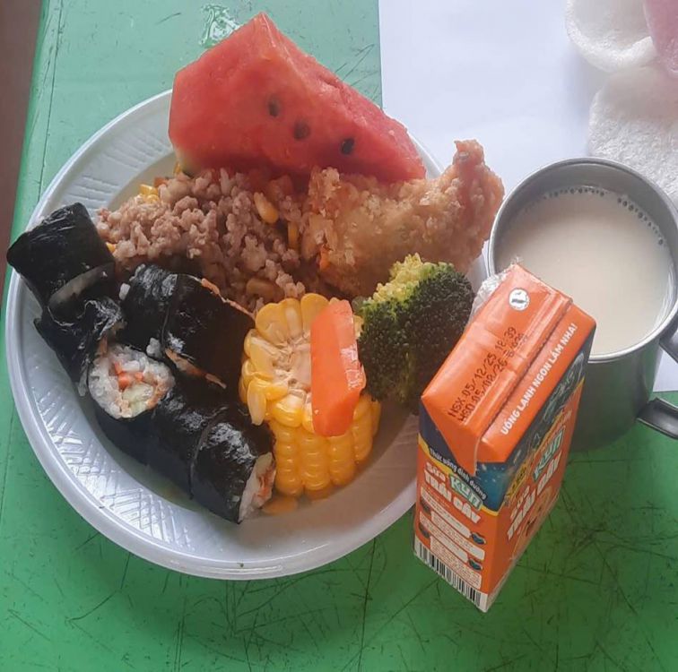 Bữa ăn hôm nay của các bé được chuẩn bị đầy đủ và đảm bảo cân bằng giữa các nhóm chất cần thiết, hấp dẫn cả về màu sắc lẫn hương vị. Các món ăn gồm: Tôm chiên xù giòn rụm giàu canxi; Cơm cuộn rong biển thơm ngon, bổ sung vitamin và khoáng chất; Thịt băm xào rau củ cung cấp đạm và chất xơ; Rau củ quả luộc giúp bé tăng cường sức đề kháng; Phồng tôm tạo thêm sự thích thú trong bữa ăn. Bên cạnh đó, các bé còn được uống Sữa tươi; Sữa ngô và thưởng thức Dưa hấu tráng miệng mát lành, bổ sung vitamin và năng lượng cho cơ thể.