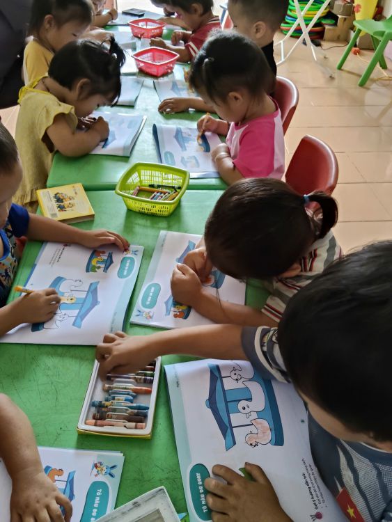Trong góc nghệ thuật, các bé được vẽ tranh, tô màu, xé dán, hát múa – thể hiện cảm xúc và sự sáng tạo của mình