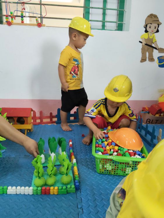 Ở góc xây dựng, trẻ cùng nhau xếp gạch, dựng nhà, đường phố, rèn luyện sự khéo léo và khả năng tưởng tượng.