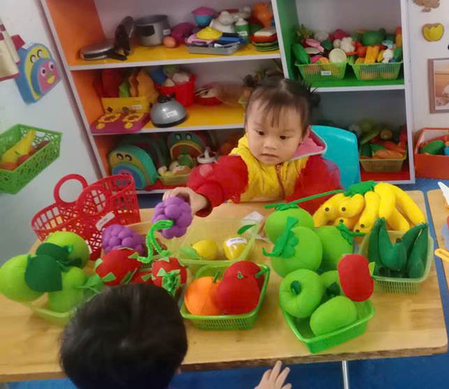 Thao tác vai: Trẻ nhập vai làm người bán hàng, người mua hàng trong “cửa hàng quả mini”. Bé lựa chọn các loại quả, biết trao đổi, nói lời cảm ơn – xin mời, bước đầu hình thành kỹ năng giao tiếp lễ phép, tự tin.