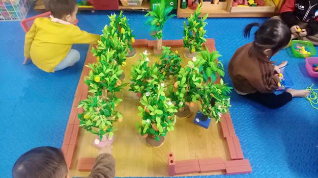 Góc hoạt động với đồ vật: Trẻ cùng nhau xếp “vườn cây ăn quả”, xếp các viên gạch cạnh nhau thành, để tạo thành mô hình theo ý thích và trồng cây ăn quả mình thích, Nhiều trẻ tỏ ra khéo léo và phối hợp tốt với bạn trong nhóm, xâu những chiếc vòng xen kẽ giữa các màu với nhau thật đẹp.